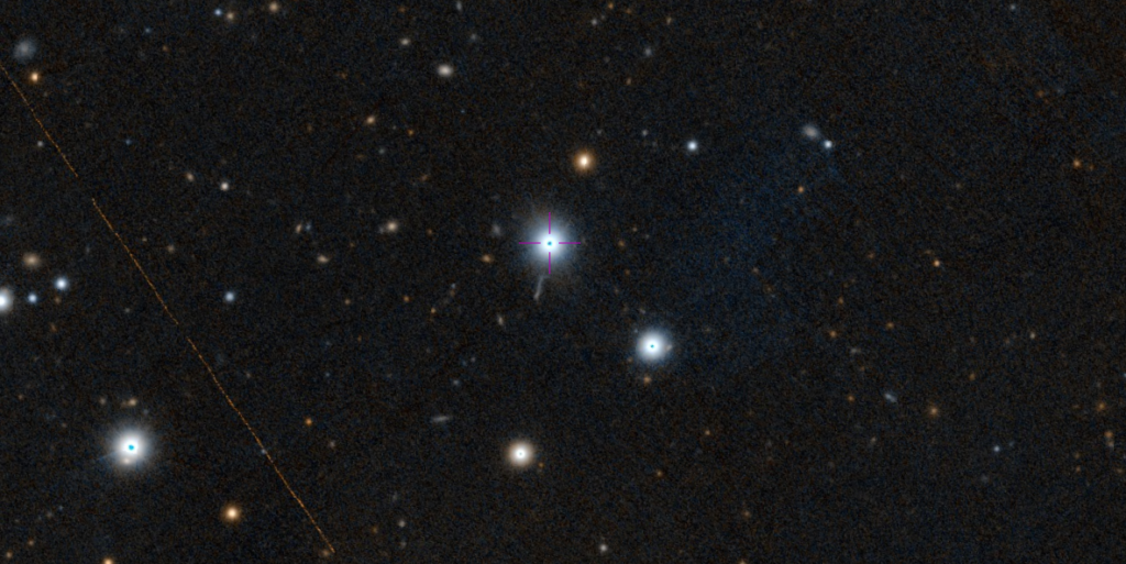 The first identified quasar was 3C 273. It is the first quasar ever discovered (1963) and identified, being an exceptionally bright, active nucleus of an elliptical galaxy. Located in the constellation Virgo at a distance of about 2.5 billion light-years, it is the brightest quasar in the Earth’s sky. It consists of a supermassive black hole consuming matter.