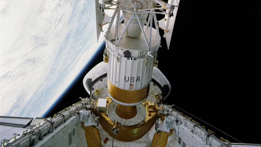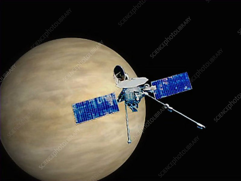 Magellan was launched into low Earth orbit on May 4, 1989, aboard the space shuttle Atlantis during the STS-30 mission. On May 5, after five Earth orbits, at an altitude of 296 km, the probe left the shuttle’s cargo bay. It was directed onto an interplanetary trajectory by an additional solid-fuel propulsion stage (Inertial Upper Stage). On August 10, 1990, after 15 months of travel, the probe entered an elliptical, nearly polar orbit around Venus, with a pericenter of 294 km.